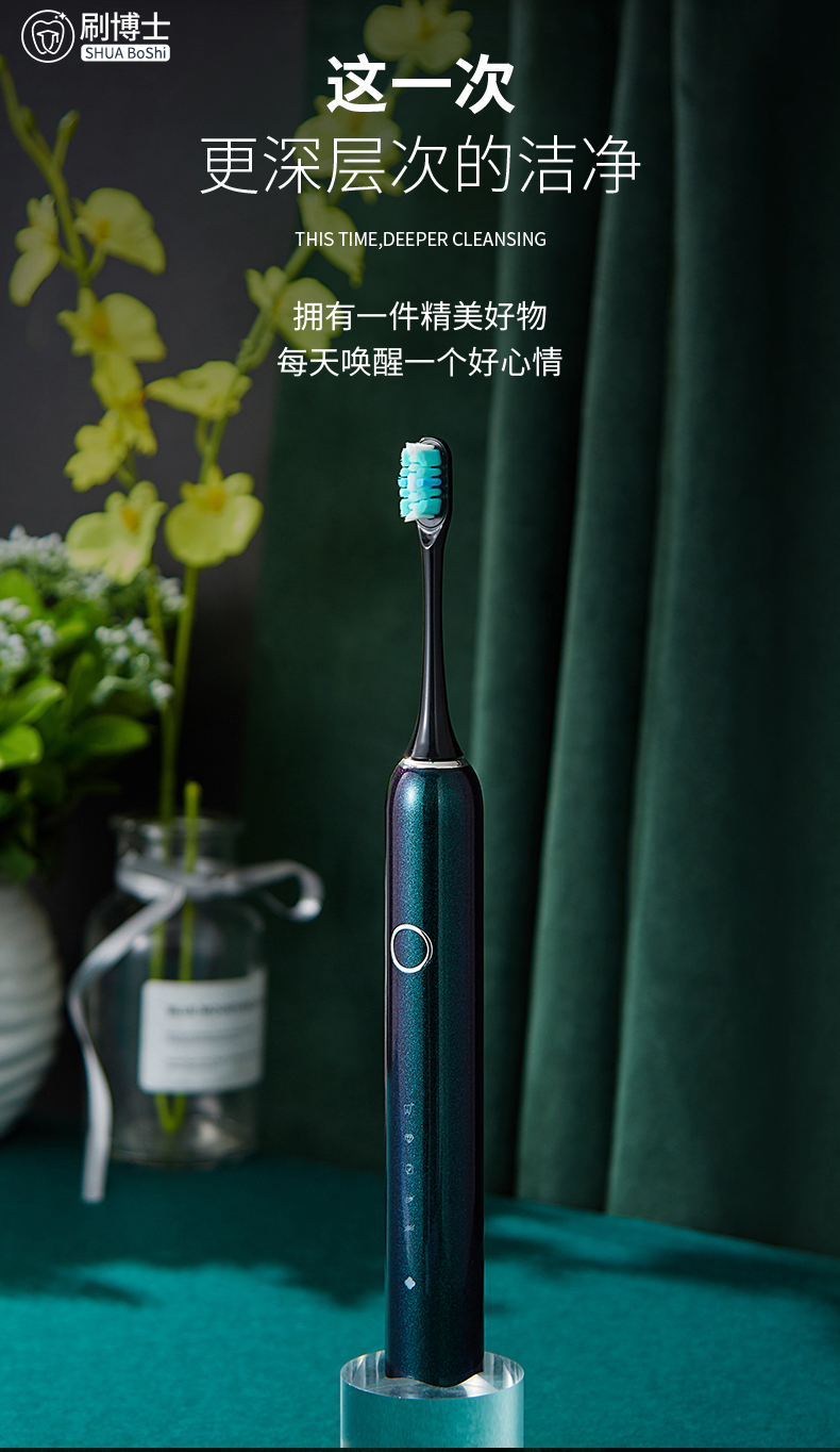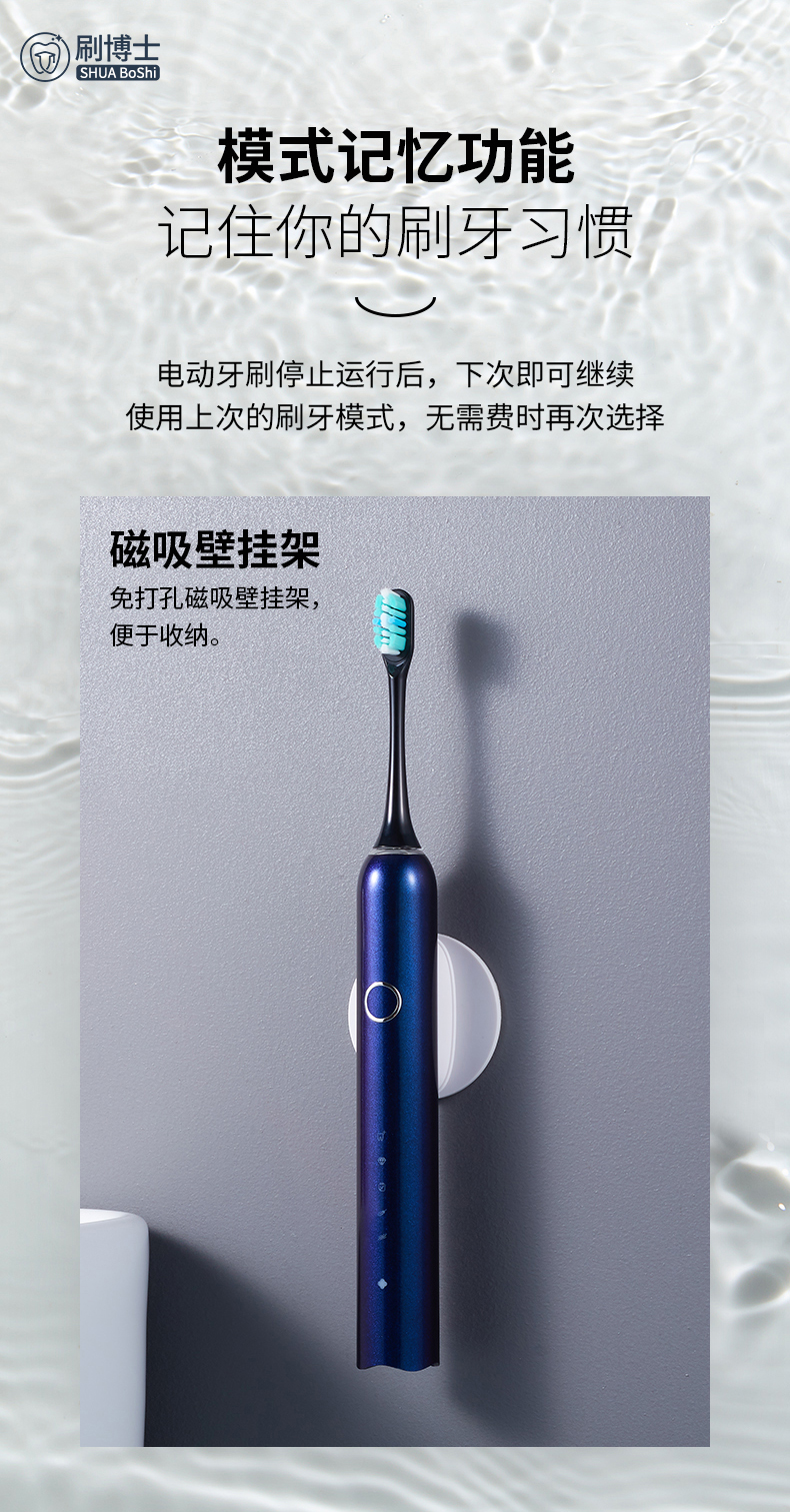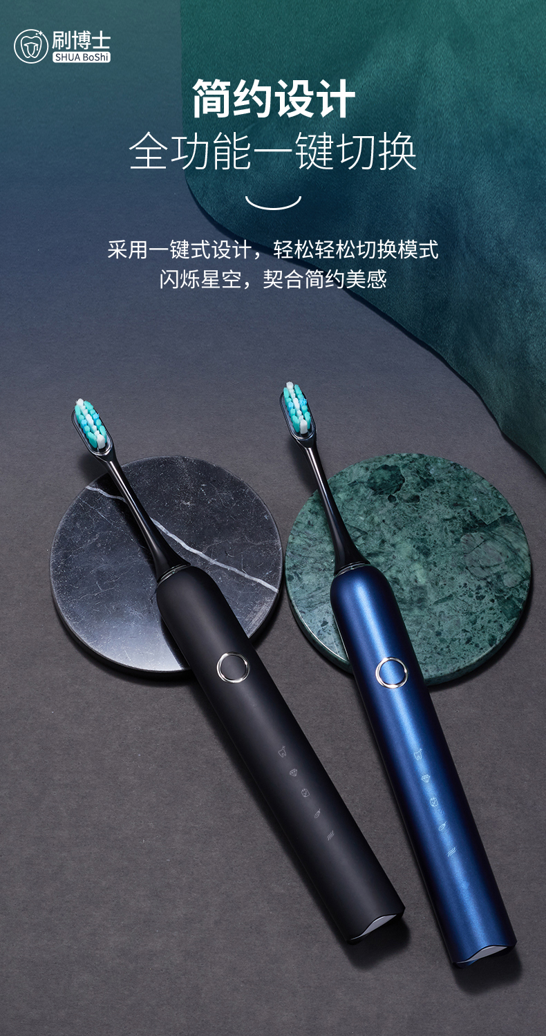 刷博士【S300智能聲波電動(dòng)牙刷】是一款集潔齒、護(hù)理及體驗(yàn)煥然一新于一身的多功能聲波電動(dòng)牙刷,采用一鍵式的簡(jiǎn)約設(shè)計(jì),5檔清潔模式,隨心掌控;此外,植入了模式記憶功能,牢牢記住你的刷牙習(xí)慣,下次刷牙,無(wú)需費(fèi)時(shí)再次選擇;強(qiáng)勁的續(xù)航功能,一年僅充1次電;高顏值的顏色設(shè)計(jì),皓月白、睿智黑、深邃藍(lán)等多種顏色選擇,遇上不同風(fēng)格的你。