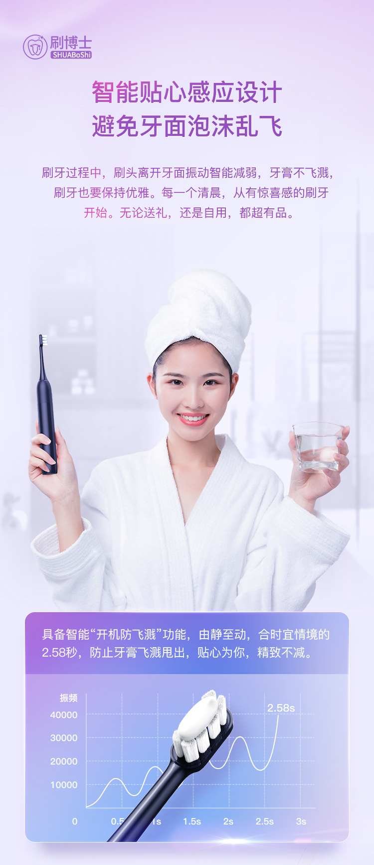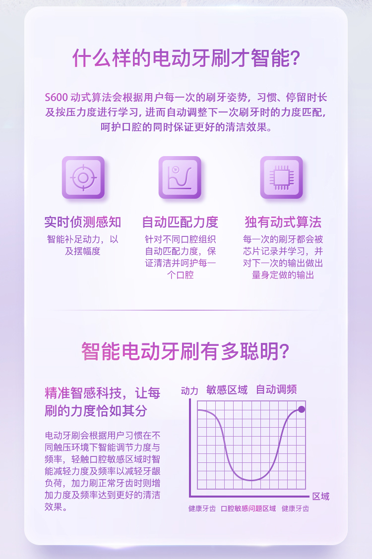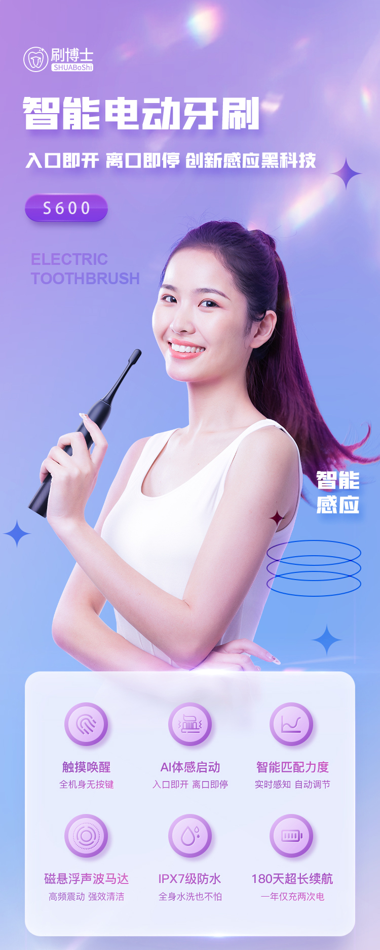 【S600 AI黑科技電動牙刷】是刷博士研發(fā)團(tuán)隊(duì)研制觸感黑科技“AI體感模式”的一款科技感滿滿的新型智能電動牙刷。例如:刷毛感應(yīng)模式,刷毛按壓牙齒時,牙刷可瞬間智能化地啟動潔牙程序,離開牙齒后1秒便自動停止;智能貼心感應(yīng)設(shè)計,刷頭離開牙面,振動智能便自動減弱,再也不用擔(dān)心牙面泡面亂飛;自動休眠模式,居家、差旅皆可無憂使用……